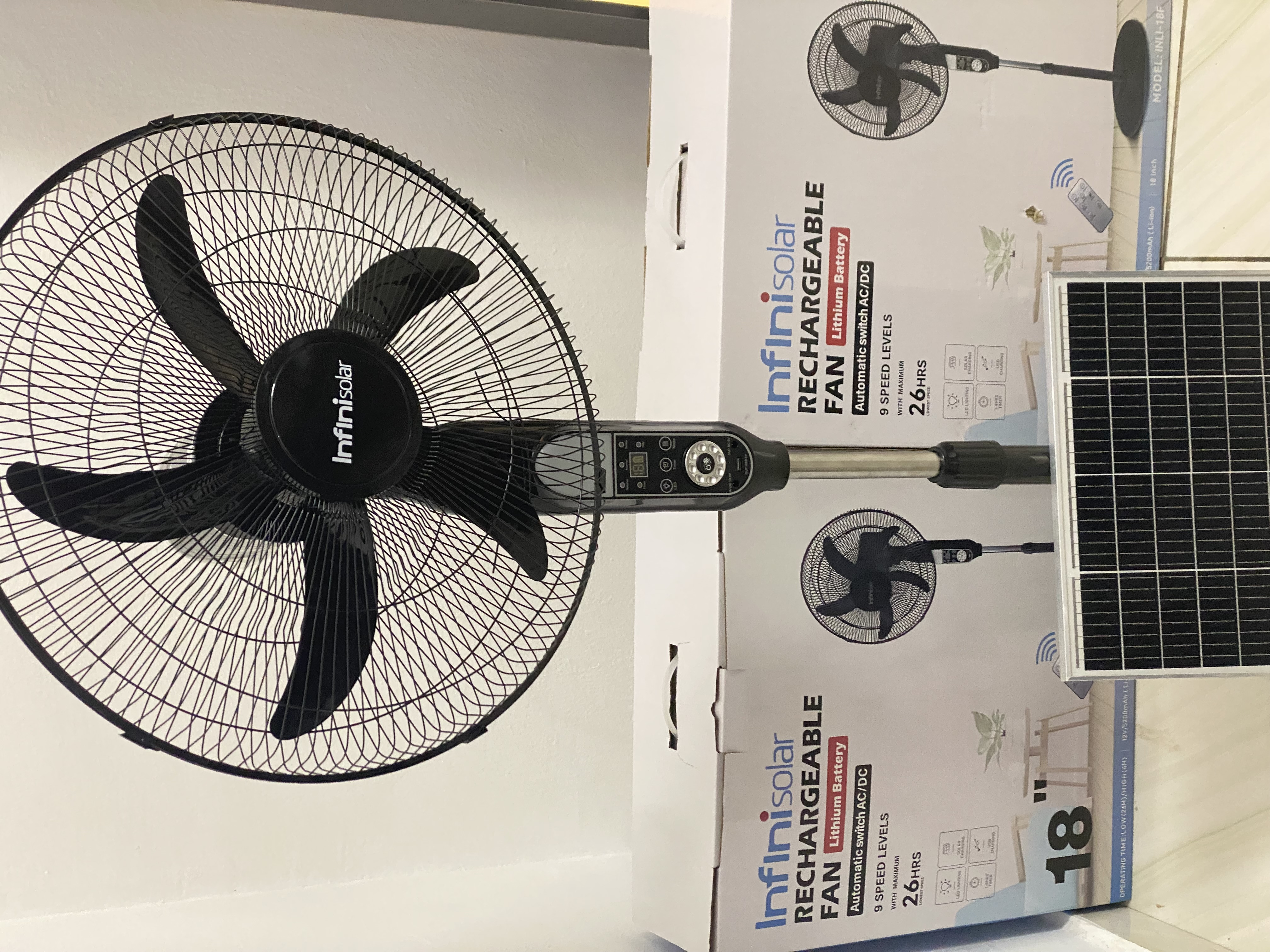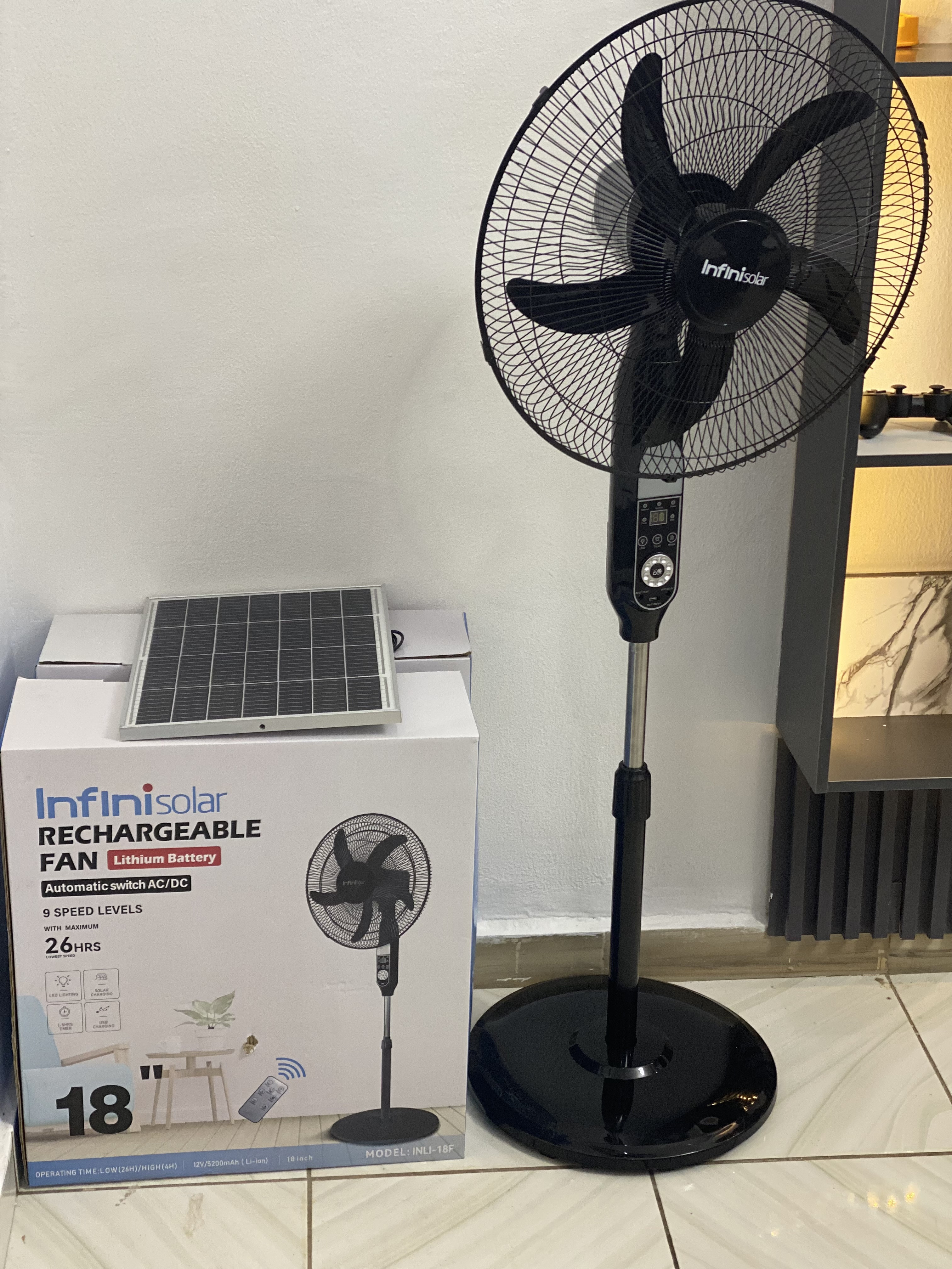 An InfiniSolar 18-inch AC/DC rechargeable fan is known for its multiple speed settings, built-in LED lighting, and remote control